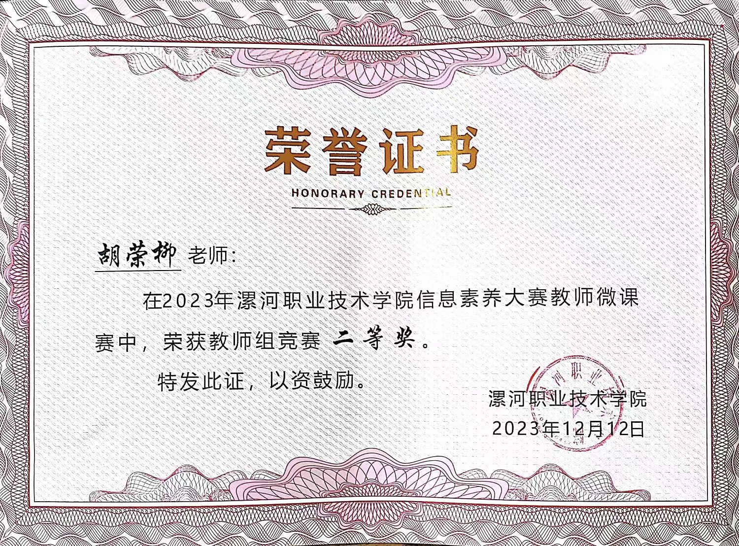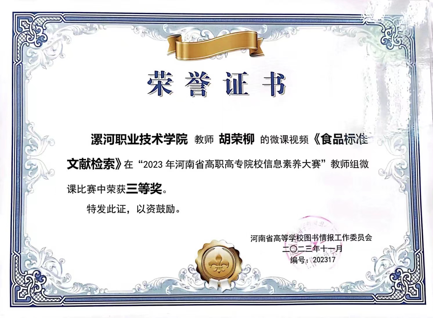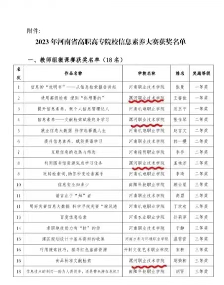 近日,2023年河南省高职高专院校信息素养大赛成绩揭晓。此次大赛中,全省教师组微课赛共计获奖18名,我系教师胡荣柳荣获三等奖,并在yl7703永利2023年信息素养大赛中荣获二等奖。我系员工马国梁在校园读书之星活动中荣获全校十大读书之星。