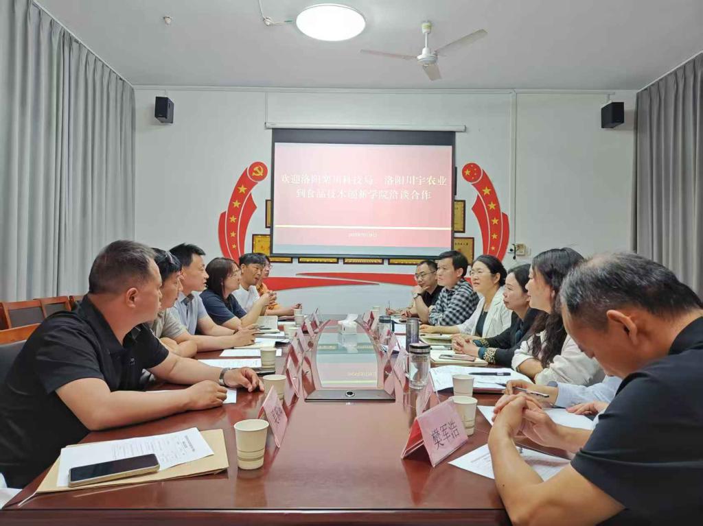 5月10日,洛阳栾川县科技局、洛阳川宇农业公司一行7人到yl7703永利就产教融合、校企合作、人才共育、科研共创等问题开展洽谈合作。栾川县科技局党组书记、局长黄正煊,副局长王亚楠、李应珂,洛阳川宇农业有限公司董事长李双松,副总经理赵宝、吴东阁等到访公司。食品工程系行政负责人崔惠玲,党总支负责人王新娜,院系领导班子成员、协同创新主任及专业教师参加座谈。