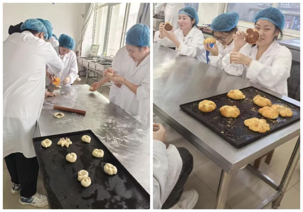 在“创意面包制作”环节中,公司为同学们准备了面粉、酵母、黄油、奶粉等食材及专业工具,同学们自由组队,分工协作,揉制面团、搭配食材、装饰成品,在称量、塑形的互动中分享生活趣事,在创意碰撞中化解学业压力。
