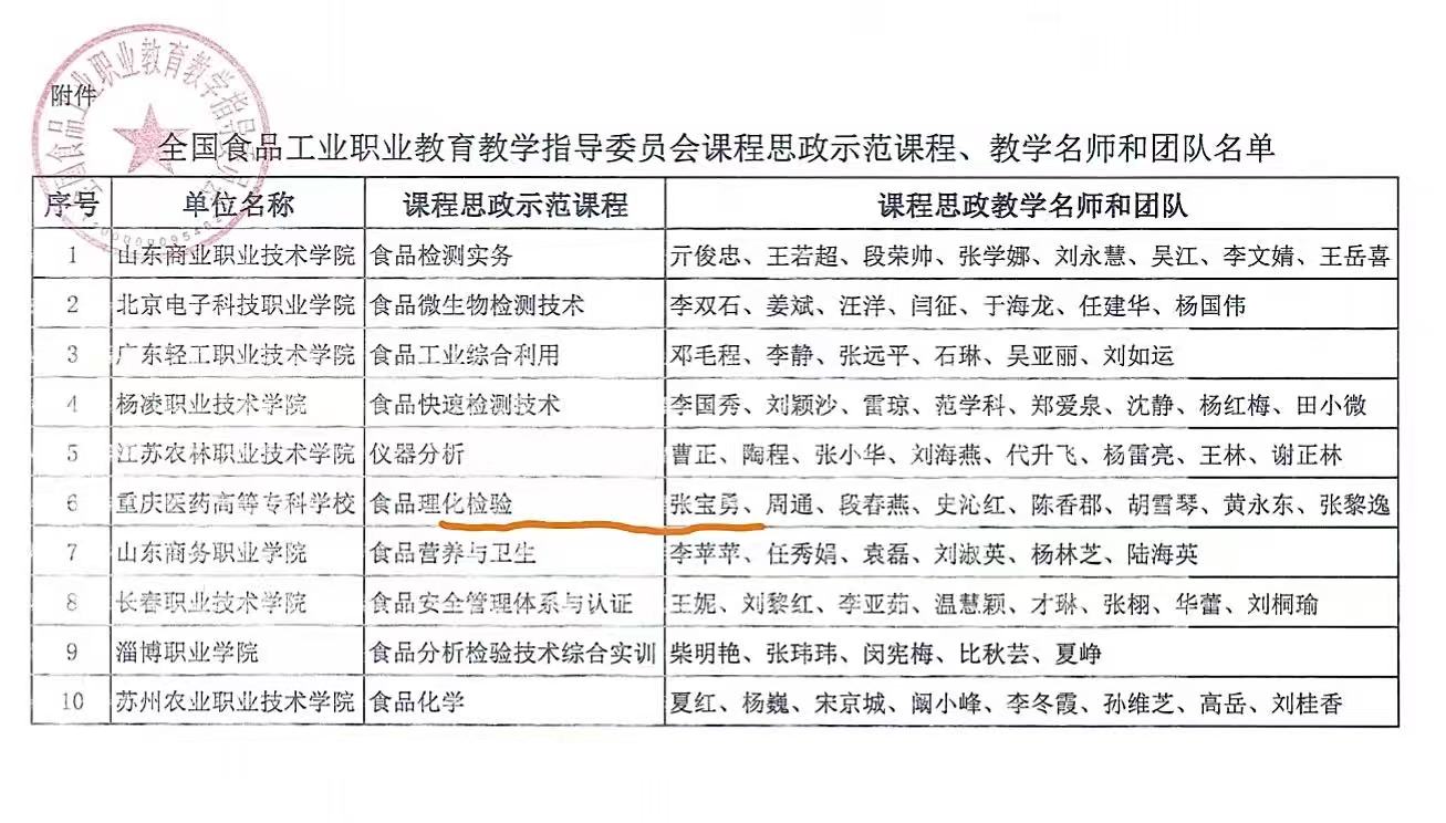 3.张宝勇老师主持的《食品理化检验》课程获得全国食品工业职业公司产品指导委员会课程思政示范课程